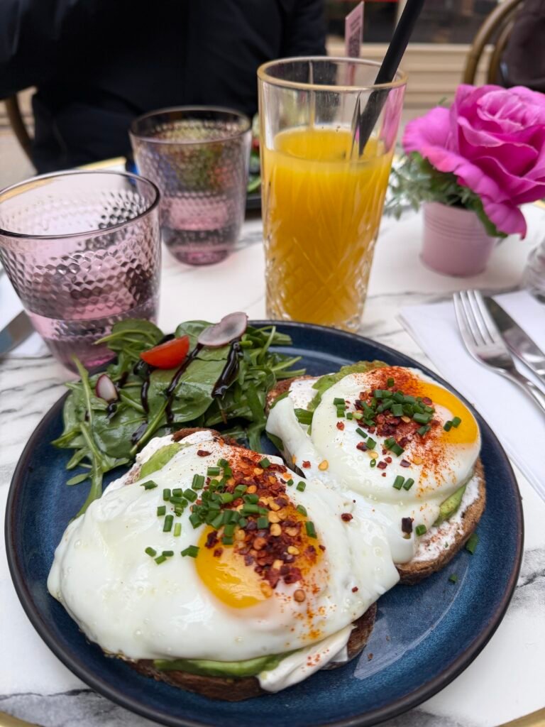 Vi bestilte to forskjellige toast-retter og en fersk juice med ingefær og appelsin. Enkle retter, med overraskende mye smak!