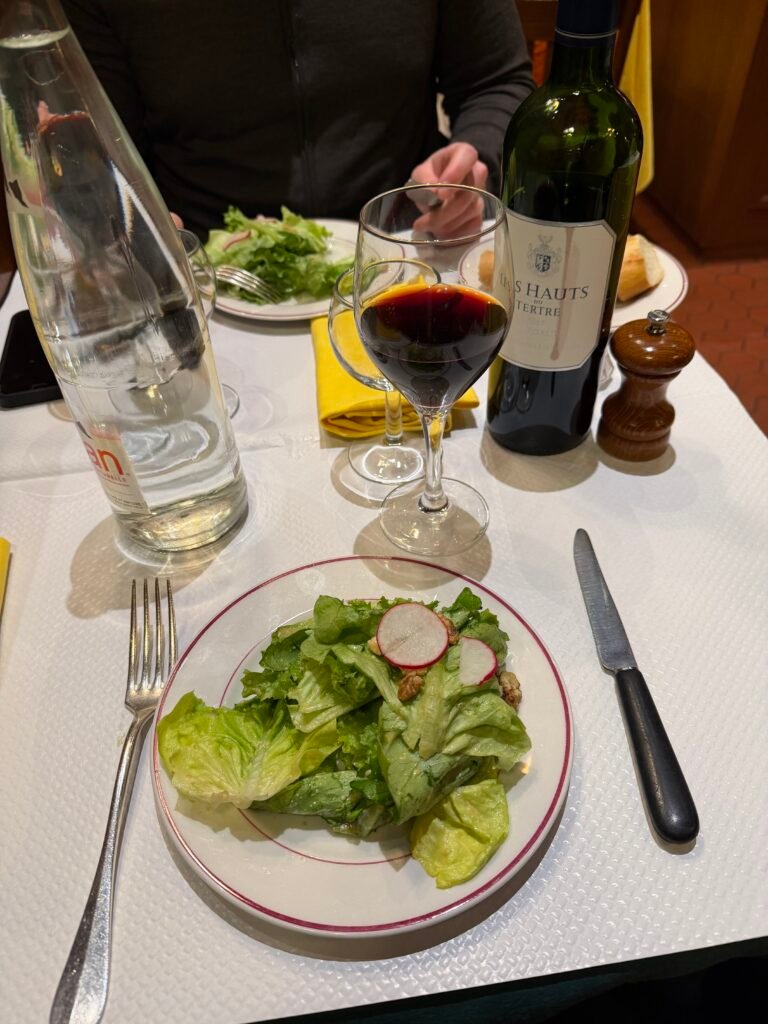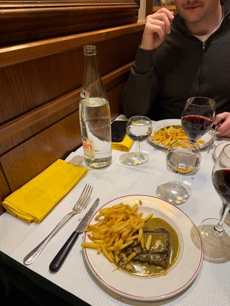 Første kvelden spiste vi på Le Relais de l’Entrecôte, en restaurant med et konsept så enkelt som det er vellykket: de serverer kun biff med pommes frites.