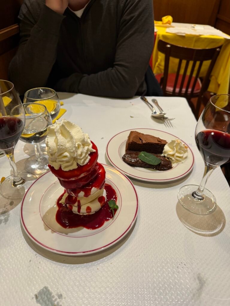 Le Vacherin d’Été – marengs med vaniljeis, bringebærsorbet og krem – traff perfekt balanse mellom søtt og friskt. Vi delte også Les Gâteaux du Relais, to sjokoladekaker som rundet av måltidet på best mulig måte. Altså, dette er faktisk noe av den beste desserten jeg har spist.