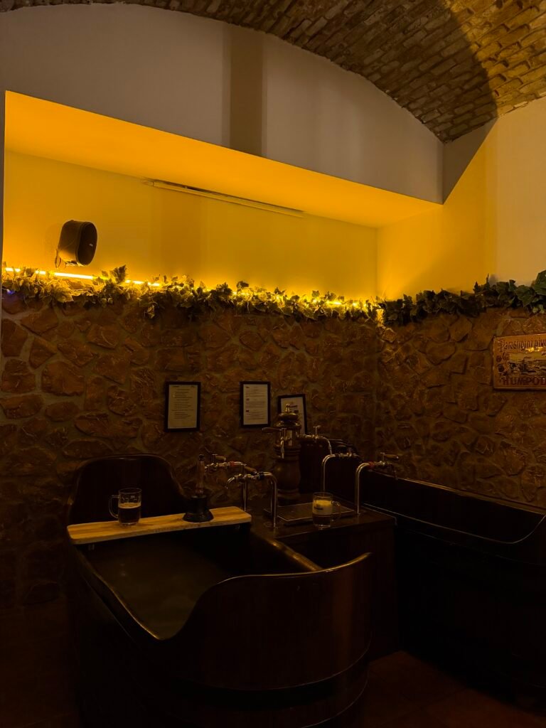 Du får et privat rom hvor du sitter i et varmt bad fylt med ingredienser brukt i ølbrygging – og det beste av alt: du har ubegrenset øl rett fra tappekran ved siden av badekaret. Du sitter bokstavelig talt og tapper deg øl mens du ligger i badet.