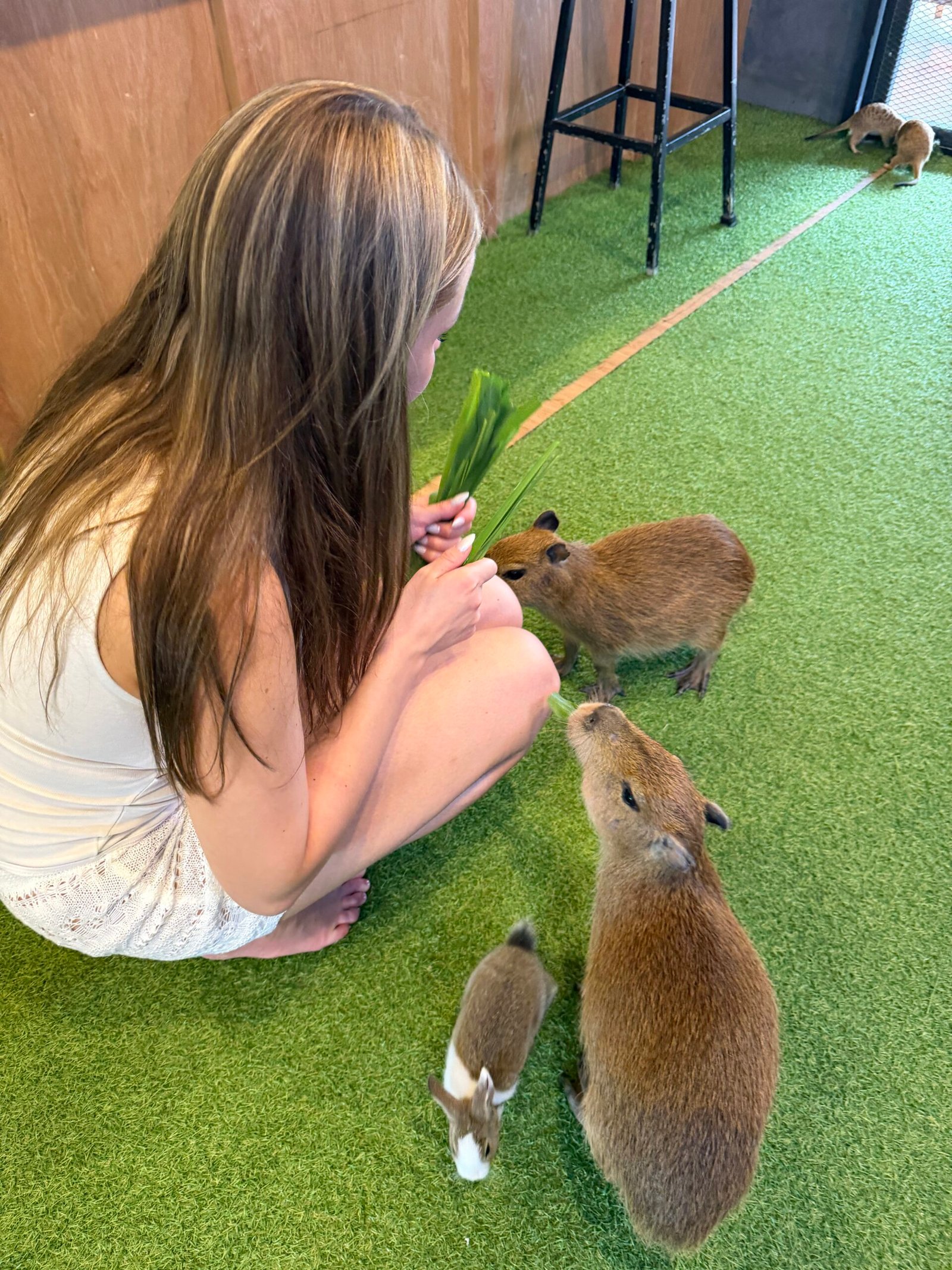 Vi besøkte en café rett ved Fisherman’s Village, hvor de i tillegg til capybaraer også hadde surikater og kaniner. Det var en sååå koselig opplevelse!!