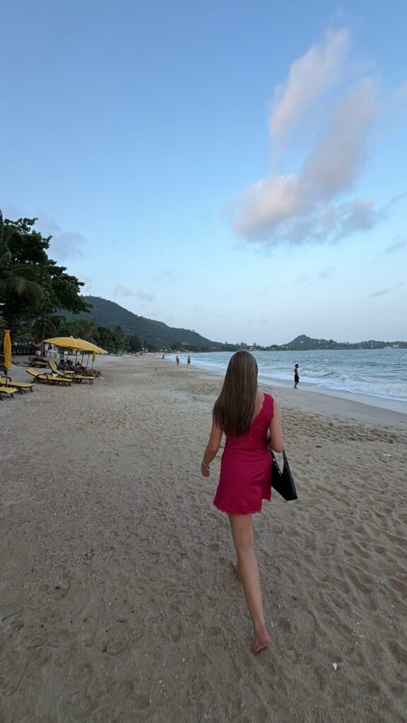 Lamai Beach er et populært område på øya, og kan være ganske livlig. Vi gikk tur langs stranden på kvelden, og langs strandlinjen ligger det flere barer hvor du kan sette deg ned med noe å drikke.